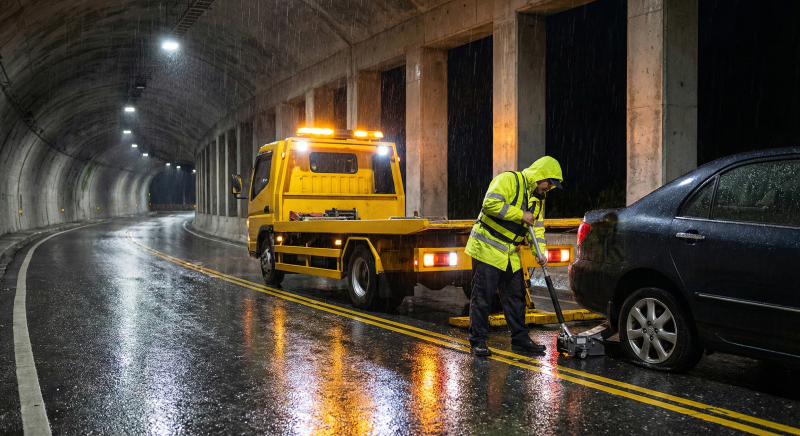 蘇花公路的陡峭與壯麗舉世聞名,但對駕駛者而言,這裡的碎石與急彎也是潛在的危機。這天深夜,一位北上的車主在明隧道出口不幸發生爆胎,冰冷的雨聲伴隨著故障的驚慌。
